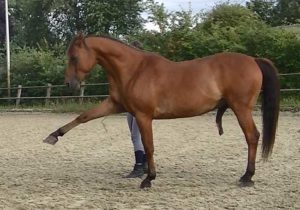 Op dit filmpje laat Bazooka een Spaanse Pas zien. Hij is eigenlijk met pensioen, maar doet dit zo af en toe nog graag. Voor het mooie zou hij zijn bekken meer mogen kantelen, en zijn schoft meer mogen liften. Op de volte raakt hij ook af en toe zijn balans kwijt. Dat zie je doordat het ene been veel hoger komt dan het andere been. Het vraagt naast kracht en balans ook veel coördinatie. Ook deze oefening moet letterlijk stap voor stap worden opgebouwd.